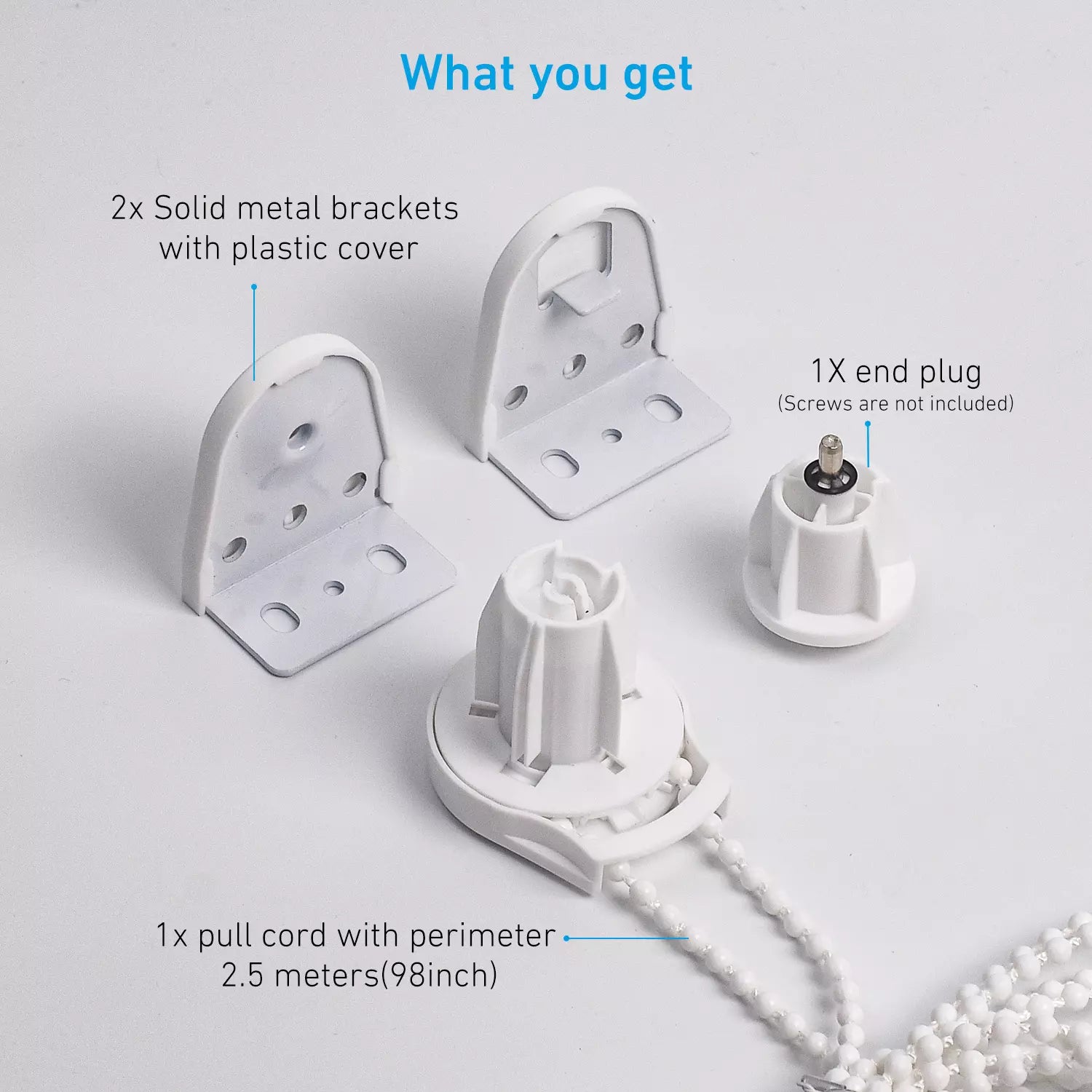 【What you get】2x Solid metal brackets with plastic cover , 1x pull cord with perimeter 2.5 meters(98inch), 1X end plug for 28mm shade tube(Screws are not included)